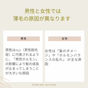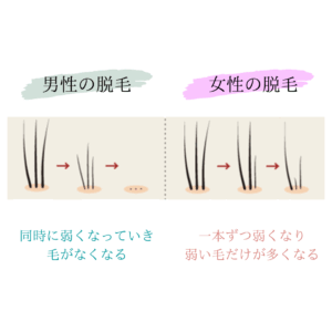 このように、男性と女性では、薄毛の原因がそれぞれ違うため、女性が男性と同じ薄毛対策や育毛ケアを行っても、結果を得るのは難しいということなのです。