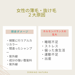 薬剤による「乾燥」や「頭皮ダメージ」によって頭皮が硬くなったり、「女性ホルモンの低下」によってヘアサイクルが乱れ、薄毛や抜け毛へと繋がってしまうのです。